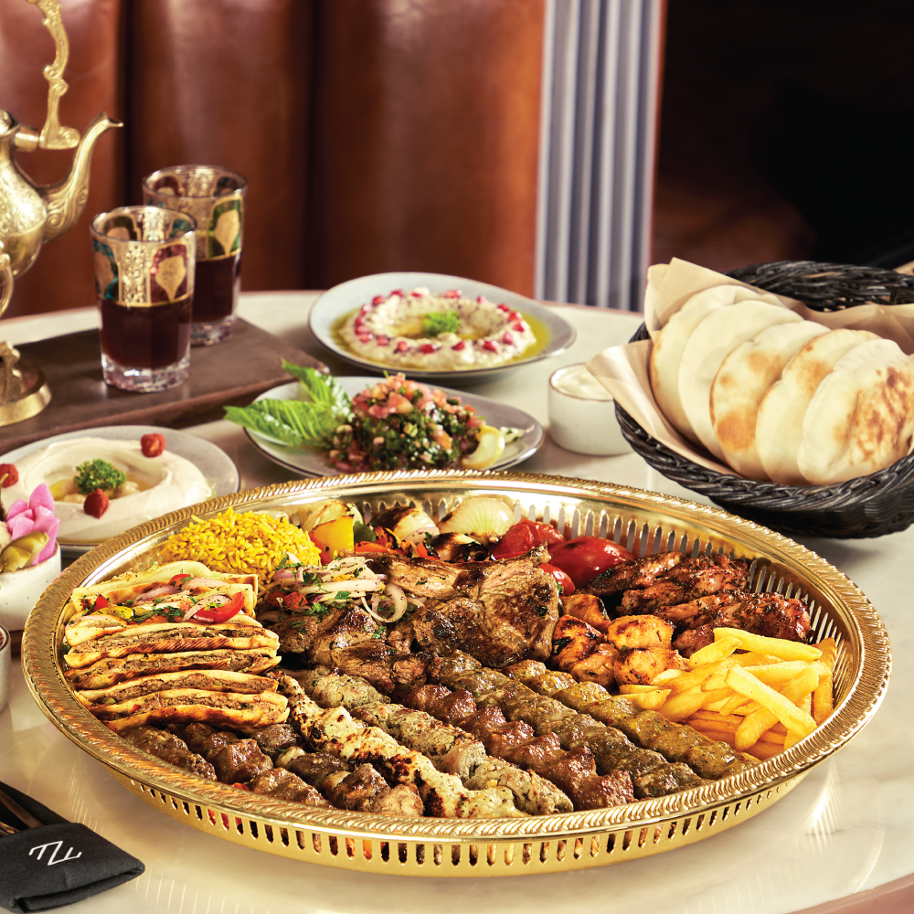 a combination of all grills in one platter – shish tawouk, kafta dajaj, kafta lahm, lahm mishwe, arayes, reyash ghanam,
