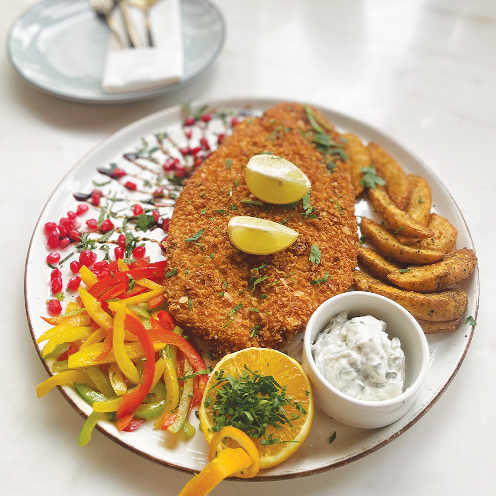 deep fried breaded hamour fish fillet served with tartar sauce & potato wedges